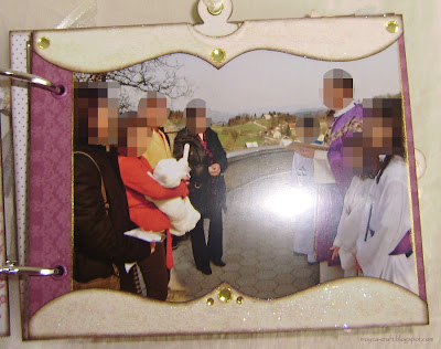 Album je v nežni roza, beli, vijolični in zlati barvi. Veliko je bleščic, nekaj okrasnih kamenčkov, trakov...Za večino rožic sem uporabila paus papir, ker deluje zelo nežno, prav zaradi svoje transparentnosti.